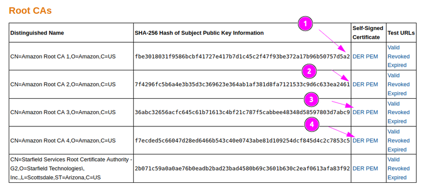Please visit Amazon Trust Services to download all necessary root CA from AWS in DER format. You only need Amazon Root CA 1, Amazon Root CA 2, Amazon Root CA 3 and Amazon Root CA 4.