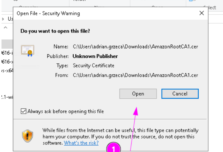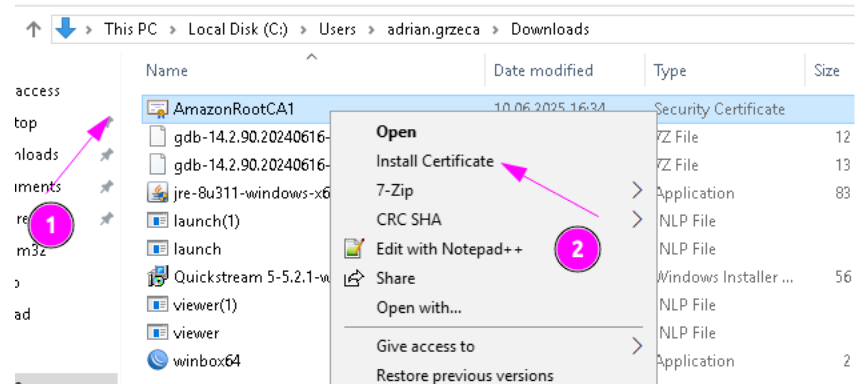 Due to issues with the Windows Certificate Store, it is recommended to install all four Amazon Web Services manually trusted CA certificates. All Quickstream's infrastructure SSL/TLS certificates are signed by those AWS certificates. It is only required on Windows!