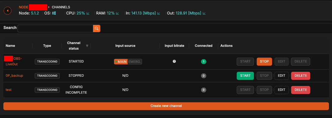 - Input source - informs the user whether the channel is currently using Main/Backup input (for Direct channels) or Main/Backup/Emergency input (for Transcoded channels). The input currently in use is marked in orange. You can click unused input if you want to start using it. A red or green dot informs the user whether the input is connected. Please note that transcoded channels always connect to main and backup inputs and keep the connection active all the time. Direct channels only maintain connection to active input, so if you switch to backup, you do not know whether the backup is working.