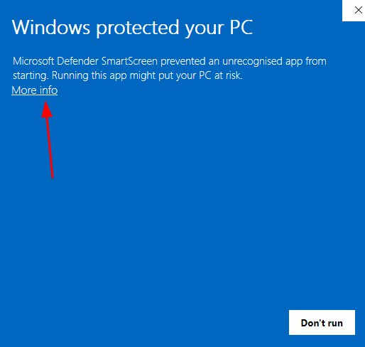 If Defender's SmartScreen prevents you from running the installer, click on More info, and then on Run anyway.