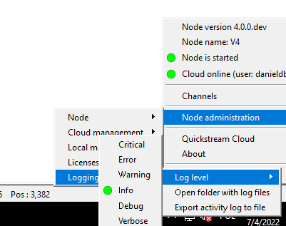 The log level can be changed using Quickstream Node Setup from the Windows tray.